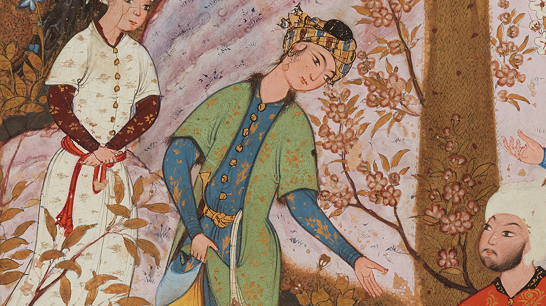 Many paintings in the Persian tradition contain hidden references that expand their meaning. In this illustration, the artist appears to liken the anonymous young beloved in the poem to the Biblical and Qur’anic figure of Joseph (Yusuf), son of Jacob (Ya’qub). Considered the epitome of beauty in the Persian literary tradition, Yusuf is often remembered for resisting the advances of his master's wife Zulaykha, just like the youth in this illustration.